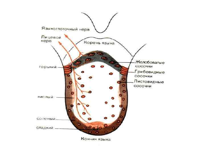 Периферический отдел вкусового анализатора: А – сосочки языка: 1 – листовидный; 2 – грибовидный; 3 – желобоватый; Б – вкусовые клетки и опорные элементы: 1 – вкусовая пора; 2 – опорная клетка; 3 – рецепторная клетка; 4 – нервные волокна