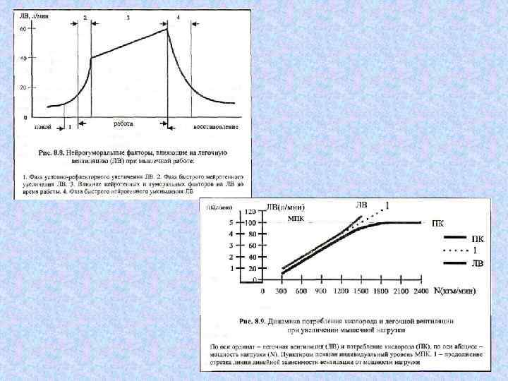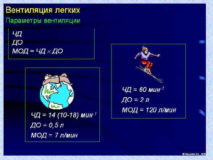 Резервы вентиляции у спортсменов и не занимающихся спортом лю При тяжелой мышечной работе Парамет ры дыхания Не спортсме ны Не спортсмены Спортсмены Абс. величина Резерв частота дыха ния, цикл/мин 14 18 6 12 40 50 3, 0 4, 0 60 90 7, 5 11 Дыхательный объем (ДО), л 0, 4 0, 5 0, 6 0, 8 1, 5 2, 0 3, 0 4, 0 2, 0 4, 0 3, 5 6, 0 ДО / ЖЕЛ, % 12 1 5 12 15 30 40 2, 5 3, 0 40 60 3, 0 4, 0 8 10 5 7 75 120 10 12 120 200 24 40 Минутный объем дыхания, л/мин