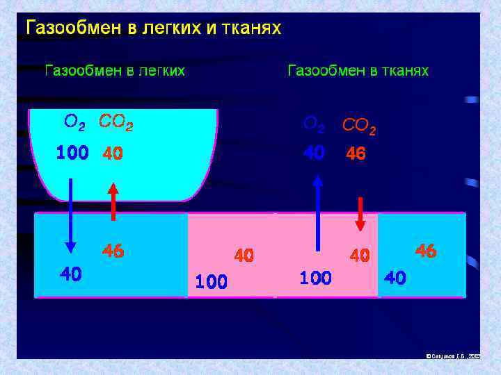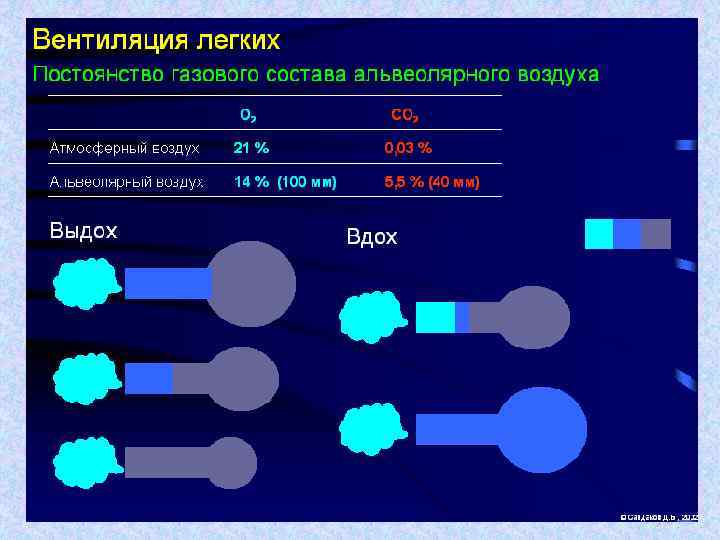 Состав атмосферного и альвеолярного воздуха ГАЗЫ Атмосферный воздух Кон цен тра Парци альн ция ое газов, % давле ние, мм рт. ст. Альвеолярный воздух к. Па Концен тра ция газов, % Парци ально е давле ние, мм рт. ст. к. Па Азот (N 2) 78, 9 600 80 74, 9 569 75, 9 Кислород (О 2) 20, 9 160 21, 3 13, 6 104 13, 9 Углекислый газ (СОа) 0, 03 0, 15 0, 02 5, 3 40 5, 3 Водяные пары (На. О) 0, 5 3, 5 0, 5 6, 2 47 6, 3