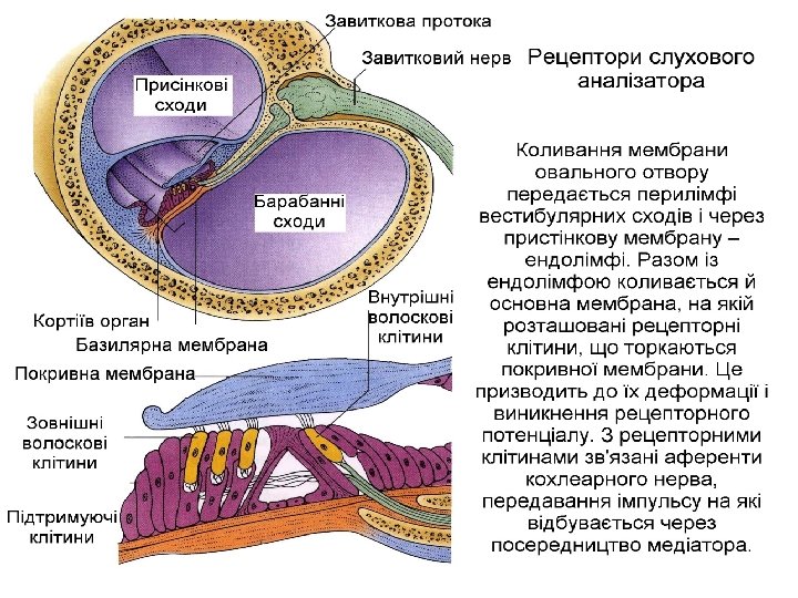 Передача звуковых колебаний каналами улитки § Колебание мембраны овального отверстия передается перилимфе вестибулярных ступенек и через вестибулярную мембрану - ендолимфе. § Вместе с ендолимфой колеблется и основная мембрана, на которой расположенны рецепторные клетки, которые дотрагиваются до покровной мембраны. Это приводит к их деформации и возникновению рецепторного потенциала. § С рецепторными клетками связаны аферентные волокна кохлеарного нерва, передача импульса на которые происходит через посредничество медиатора.