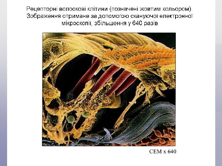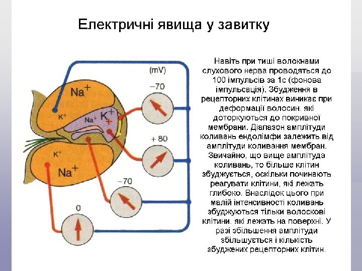 Электрические явления происходят в улитке § Возбуждение в рецепторных клетках возникает при деформации волосков, которые прикасаются к покровной мембране. § Диапазон амплитуды колебаний ендолимфы зависит от амплитуды колебания мембран. Конечно, чем выше амплитуда колебаний, тем больше клеток возбуждается, поскольку начинают реагировать клетки, которые лежат глубоко. § Вследствие этого при малой интенсивности колебаний возбуждаются только волосковые клетки, которые лежат на поверхности. В случае увеличения амплитуды увеличивается и количество возбужденных рецепторных клеток.