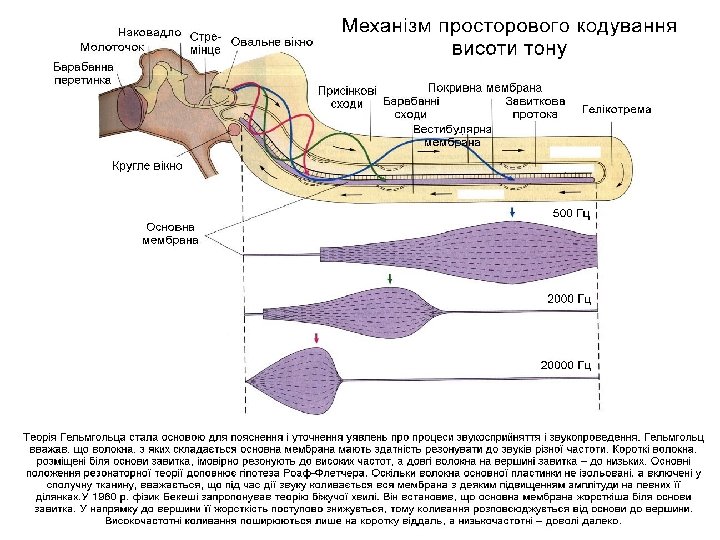 Теории звуковосприятия. Теория Гельмгольца § Гельмгольц считал, что волокна, из которых составляется основная мембрана имеют способность резонировать к звукам разной частоты. Короткие волокна, размещенные возле основы завитка, вероятно резонируют к высоким частотам, а длинные волокна на вершине завитка - к низким. § Основные положения резонаторной теории дополняет гипотеза Роаф-Флетчера. Поскольку волокна основной пластинки не изолированы, а включенные в соединительную ткань, считается, что во время действия звука колеблется вся мембрана с некоторым повышением амплитуды на определенных ее участках.