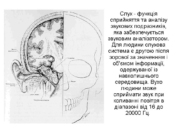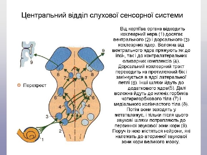 Характеристика проводникового и центрального отдела слухового анализатора § Кохлеарний нерв достигает вентрального и дорсального кохлеарних ядер. Волокна от вентрального ядра направляются как к ипси-, так и к контралатеральным оливам. § Дорсальный кохлеарний тракт переходит на противоположную сторону и заканчивается в ядре латеральной петли. Нейроны, которые поднимаются из олив, также отдают колатерали ядрам латеральной петли. Дальше волокна идут к нижним бугоркам четверохолмия и медиального коленчатого тела. § Потом они заходят в метаталамус, и только после этого звуковые пути попадают к первичной звуковой зоне коры. Рядом с ней содержатся нейроны, которые принадлежат к вторичной звуковой зоне коры большого мозга. § Ядро коркового анализатора слуха находится в извилине Гешля (средний отдел на медиальной поверхности верхней височной извилины). В этом корковом центре звуковые сигналы, которые приходят из завитки внутреннего уха по слуховым путям, воспринимаются как звуки, которые отличаются по тону, качеству и громкости.