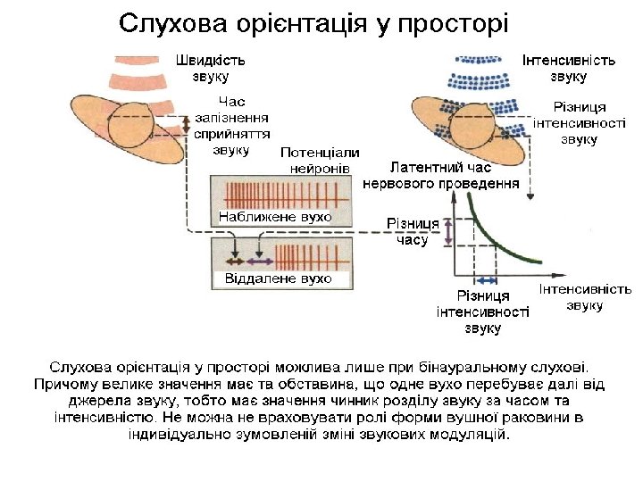 Значение бинаурального слуха § Корковые нейроны активизируются по-разному: одни – от контралатерального уха, другие - ипсилатеральними стимулами, третьи - только при одновременной стимуляции обеих ушей. Возбуждаются они, как правило, целыми звуковыми группами. Повреждение этих отделов ЦНС ухудшает восприятие языка, пространственную локализацию источника звука. § Слухова ориентация в пространстве возможна лишь при бинауральном слухе. Причем большое значение имеет то обстоятельство, что одно ухо находится дальше от источника звука, т. е. имеет значение фактор раздела звука по времени и интенсивности. § Нельзя не учитывать роли формы ушной раковины в индивидуально обусловленном изменении звуковых модуляций.