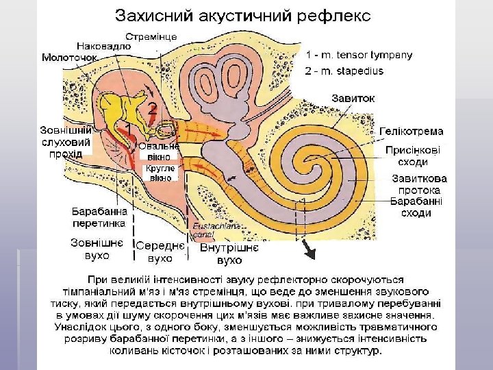 Защитный акустический рефлекс § В полости среднего уха есть две мышцы (m. tensor tympanи, m, stapedиus). При большой интенсивности звука рефлекторно сокращаются тимпаниальная мышца и мышца стремечка, что ведет к уменьшению звукового давления, которое передается внутреннему уху. § Время рефлекса около 10 мс, что недостаточно для эффективной защиты уха от громких внезапных звуков. Тем не менее при продолжительном пребывании в условиях действия шума сокращение этих мышц имеет важное защитное значение. § Вследствие этого уменьшается возможность травматического разрыва барабанной перепонки, снижается интенсивность колебаний косточек и расположенных за ними структур. § В связи с некоторым отставанием рефлекторного ответа у рабочих некоторых областей, которые работают в условиях интенсивного шума, развивается глухота.