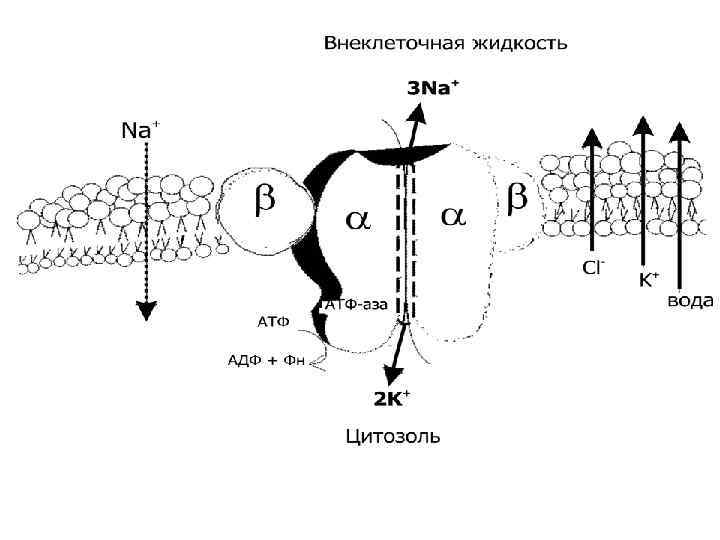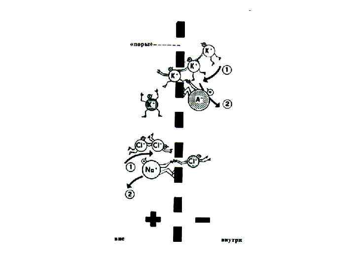 Неравномерное распределение ионов обусловлено: 1. Активным транспортом ионов с помощью мембранных насосов, 2. Избирательной проницаемостью мембраны для неорганических ионов. 3. Плохой проницаемостью для органических анионов , которые скапливаются на внутренней поверхности мембраны.