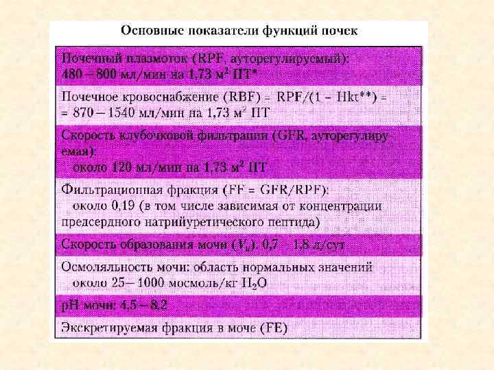 Расчет скорости клубочковой фильтрации по D. W. Cockroft и M. N. Gault (Brenner, 2004) Необходимо знать только концентрацию креатинина в крови Мужчины [(140 - возраст) Х масса тела (кг)] / (72 Х PCr) Женщины – коэф. 0, 85 [(140 - возраст) Х масса тела (кг)] Х 0, 85 / (72 Х PCr) Величина клубочковой фильтрации при массе тела 70 кг и площадью поверхности тела 1, 73 м 2 у мужчин – 120 -125 мл/мин у женщин – 110 мл/мин