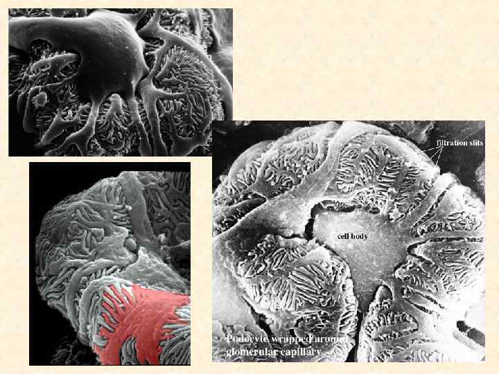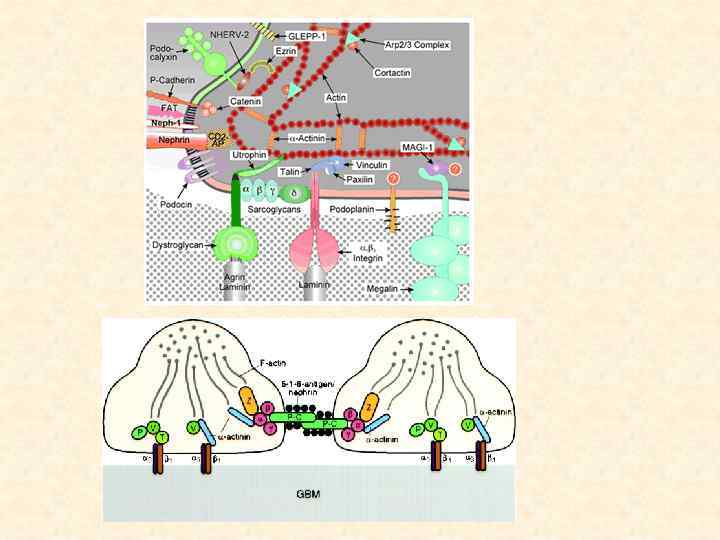 Гломерулярный фильтр Фильтрация идет через 3 слоя: эндотелий капилляров: - не пропускает форменных элементов и макромолекул - при нормальной скорости кровотока фенестры (50 -100 нм) прикрыты комплексом глобулярных белков • базальную мембрану (3 слоя, 250 -400 нм, общая для эндотелия и подоцита) - задерживает белки>35000 Да (альбумины, глобулины) (>6 нм) 80 -100 нм - поры имеют отрицательный заряд - проникают измененные альбумины и белки с положительным зарядом сохраняется норм. белковый состав плазмы подоциты (эпителий висцерального листка капсулы Боумена) - поры в щелевых мембранах (10 нм) между ножками подоцитов пропускают очень мало белков, далее захватываются клетками проксимального канальца и гидролизуются В норме с мочой выделяется <100 г белка/сутки