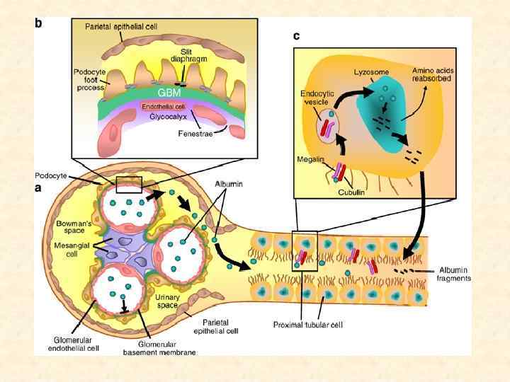 Реабсорбция белка 99% в S 1 фрагменте проксимального канальца В мембране существуют системы транспорта для разных белков (альбумина, миоглобин и др. ) Реабсорбция идет путем пиноцитоза – белок эндосома соединение с лизосомами расщепление транспорт аминокислот, ди- и трипептидов через базальную мембрану В клубочках могут фильтроваться измененные эндогенные белки и чужеродные белки Реабсорбция и расщепление экзогенных белков (в т. ч. пептидных гормонов) важно для нормализации белкового «зеркала» крови и предотвращения аллергических реакций Если концентрация белка в крови превышает возможности транспортных систем - он появляется в моче