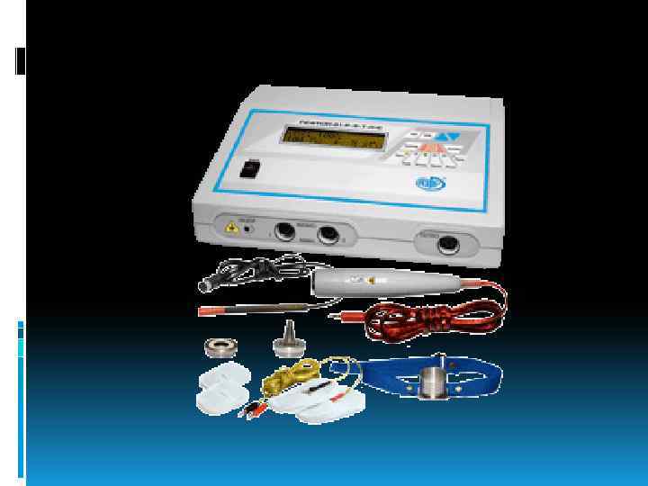 В стоматологической практике находит применение электротерапия: • Постоянным электрическим током низкого напряжения (гальванизация, лекарственный электрофорез, электрообезболивание); • Импульсными токами низкой частоты и низкого напряжения (лечение диадинамическими, синусоидальными, модулированными, флюктуирующими токами, импульсный ток низкого напряжения, используемый для электродиагностики и ЭОД); • Переменными электрическими токами высокой частоты (дарсонвализация, диатермокоагуляция); • Электрическим, магнитным, электромагнитным полем (электрическое поле ультравысокой частоты – ЭГ-УВЧ, переменное магнитное поле ультравысокой частоты - МПУВЧ, микроволновая терапия, магнитотерапия).