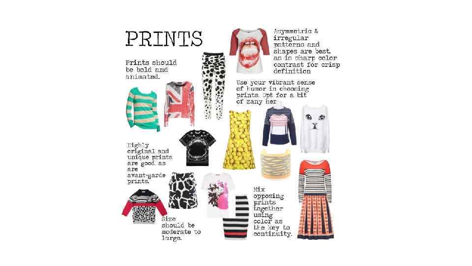 ПРИНТЫ: Принты должны быть смелыми и живыми. Асимметричные и неправильные лучше всего, как и резкий контраст цвета для четкого определения формы. Очень оригинальные и уникальные принты хороши, как и авангардный рисунок. Смешивайте противоположные принты вместе, используя цвет как ключ к непрерывности. Используйте ваше яркое чувство юмора в выборе рисунка. Здесь вы можете выбрать что-то немного сумасбродное. Это будет четко выражать ваш уникальный подход к жизни в самой привлекательной форме, которую только можно себе представить! Размер должно быть от умеренного к большому. Избегайте: Чрезмерно смешанных акварельных принтов. Малых, симметричных принтов. цветочных принтов (если только они не являются абсолютно дикими и современными). АКСЕССУАРЫ: Ваши аксессуары должны быть четкими, скульптурными, угловатой формы, и склонятся к асимметрии или неправильной геометрии. Если используется отделка, то она должна быть очень оригинальной, либо авангардной, либо слегка непривычной. ОБУВЬ: Обувь должна быть угловатой и неправильной формы. Слегка тяжелой по стилю. Низкий, сужающийся каблук или очень прямой, высокий каблук. Асимметричная обувь на низком ходу. Ярко окрашенные или туфли с принтом для веселья! Избегайте: Обычных лодочек. Нежной обуви с ремешками. Изысканной отделки.