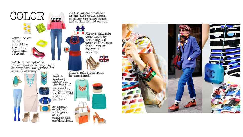 Избегайте: Оборчатых, летящих платьев. Свободных, струящихся платьев. Традиционных симметричных платьев (платьев рубашек и т. д. ). Широких, бесформенных платьев. ЦВЕТ: Используемые вами цвета должны быть электрическим, смелыми и яркими. Дикие сочетания цветов, об использовании которых другие могут только мечтать, на вас смотрятся очень освежающе и утонченно. Разноцветные брызги, играющие на фоне очень светлого, или очень темного фона одинаково интересны. Всегда оживляйте ваш вид, разбивая ваш силуэт большим количеством красочных акцентов. Если в вашем наряде вы используете один оттенок как базовый, то непременно акцентируйте его различными смелыми и яркими штрихами, иначе вы потеряете ту динамическую энергию, которая является вашей самой большой ценностью. Резкие цветовые контрасты прекрасны. Будьте крайне оригинальны в выборе цвета и его комбинации. Избегайте: Одной длинной линии любого цвета. Монохромных цветовых схем. Чрезмерно размытых пастелей (если только они не хорошо акцентированы или четко выделяются в рисунке). Нейтральных цветов, если только они не сильно акцентированы.