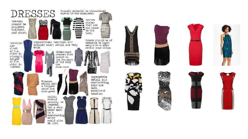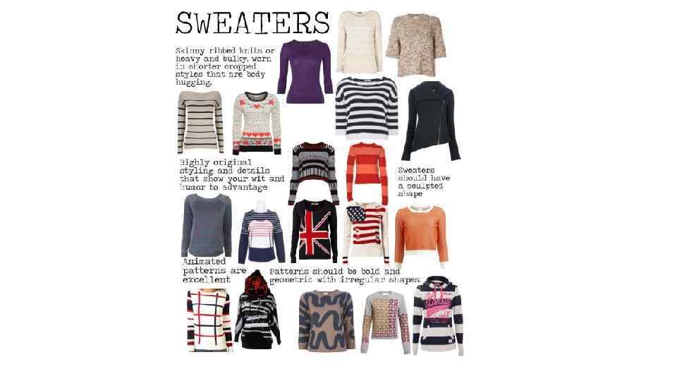 СВИТЕРА: Свитера должны иметь форму, быть скульптурными, облегающими, из ребристого трикотажа, или быть плотными и объемными. Те которые прилегают к телу носятся короткими. Модели должны быть смелыми и геометрически неправильной формы. Веселые принты превосходны, как весьма оригинальный дизайн, а так же как деталь, которая показывает ваше преимущество - юмор и остроумие. Подлечники должны носиться всегда. Скульптурные и изогнутой формы в обтягивающем трикотаже. Большие подплечники четкой формы, в объемных коротких стилях. Избегайте: Традиционных симметричных форм ( свитеров шетланд с закрытой горловиной или кардиганов). ПЛАТЬЯ: Платья должны быть скульптурными, подогнанными по фигуре, и короткими. Обтягивающие стили, прилегающие близко к телу. В плечах очень расширенные, или обтекаемо изогнутые. Асимметричные детали и контрастная отделка являются превосходными штрихами. Талия может быть заниженной, так же может быть использован широкий упругий пояс контрастного цвета. Длина должна быть короткой, если юбка прямая, и длиннее, если юбка с неравномерным подолом. Модели с напускной и спущенной талией тоже хороши. Ткань должна быть умеренной по плотности или легкой, чтобы всегда показывать фигуру. Платья из трикотажа в рубчик, которые облегают контуры тела, превосходны. Асимметричный подол и спущенная талия - очень шикарные детали.