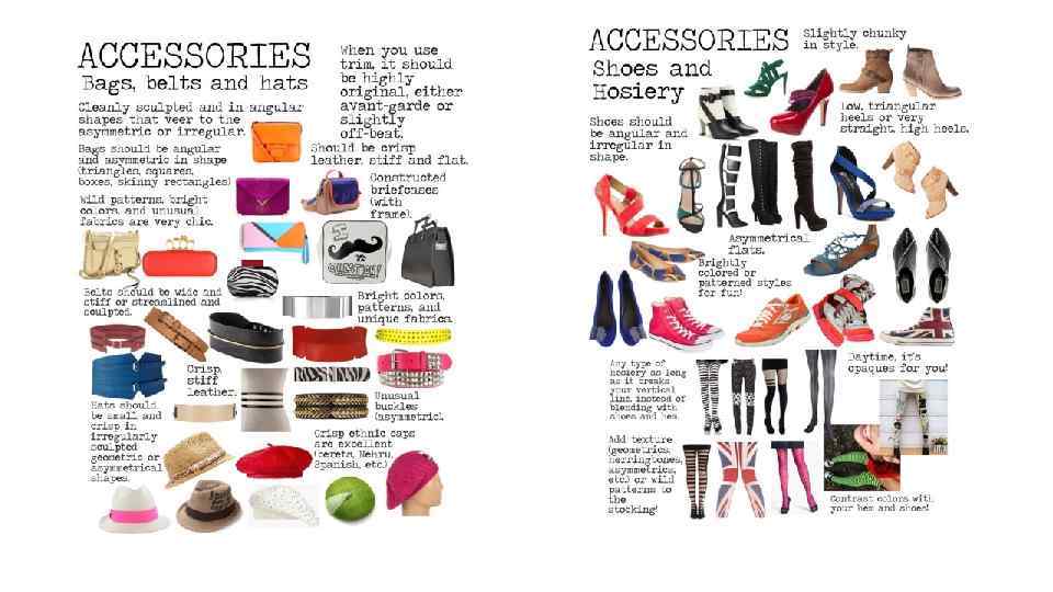 СУМКИ: Сумки должны быть угловатой и асимметричной формы (треугольники, квадраты, тонкие прямоугольники, коробочки и т. д. ) Кожа должна быть плотной, держащей форму и гладкой. Дикие узоры, яркие цвета и необычные ткани смотрятся очень шикарно. Держащий форму портфель для документов (на жесткой подкладке). Избегайте: Маленьких, округлых сумок с нежными декоративными ремнями или отделкой. Больших бесформенных сумок. симметричных сумок – кошельков среднего размера с рамой и ручкой. Дипломатов. РЕМНИ: Ремни должны быть широкими и плотными или гибкими и скульптурными. Яркие цвета, узоры и уникальные ткани. Держащая форму, плотная кожа. Необычные асимметричные пряжки. Избегайте: Деликатных, затейливых поясов. Корсетов. Спокойных узких ремней. ШЛЯПЫ: Шляпы должны быть небольшими и четкими; скульптурные и неправильной геометрической формы или асимметричные. Держащие форму этнические головные уборы превосходны (береты, шапки неру из Южной Азии , испанские шляпы и т. д. ) Избегайте: Преувеличенных не держащих форму стилей с гибкими полями. Нежных, декоративных стилей.