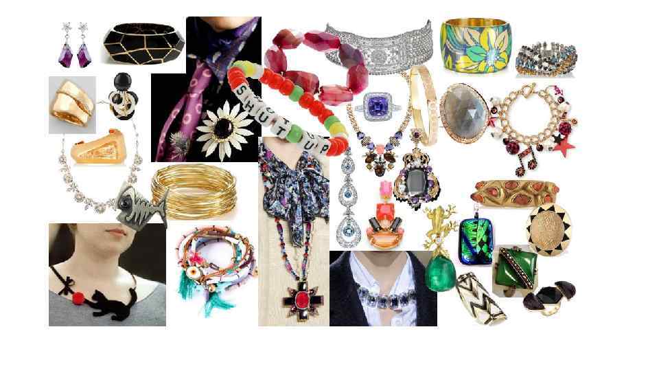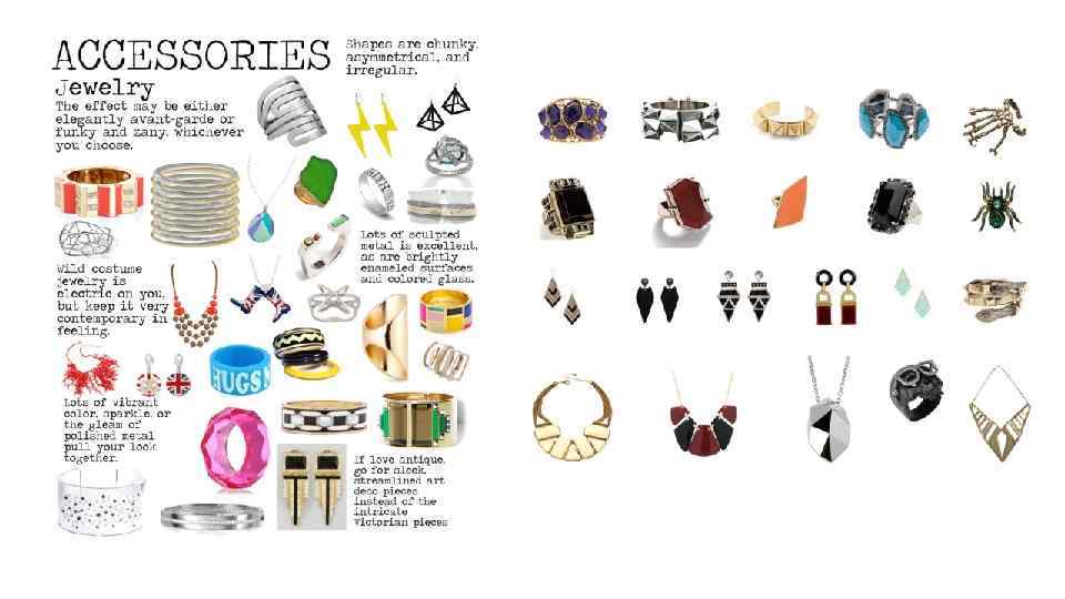 БИЖУТЕРИЯ И ЮВЕЛИРНЫЕ УКРАШЕНИЯ: Украшения являются одним из ваших самых необходимых аксессуаров. Это добавляет одновременно и изысканности и остроумия в ваш образ. Эффект может быть как элегантно авангардный так и ультра модный и сумасбродный- выбор за вами. Формы квадратные, асимметричные, и неправильные. Много скульптурного металла отлично смотрится, а так же блестящие эмалированные поверхности, и цветное стекло. Дикие украшения на вас смотрится электрически, но они должны выглядеть современно. Если у вас есть любовь к старине, обратите внимание на эпоху арт-деко. Гладкие обтекаемые детали, а не сложные как в викторианском стиле или арт-нуво. Много ярких цветов, сияние или блеск полированного металла соберут ваш образ вместе. Избегайте: Слишком деликатных или сложных украшений. Тяжелых этнических украшений (если только они не являются произведениями современного искусства, и не выглядят очень скульптурно). Мелких, симметричных украшений. Висячих, сверкающих стилей.