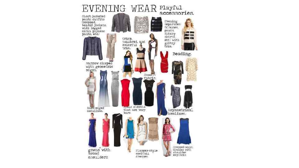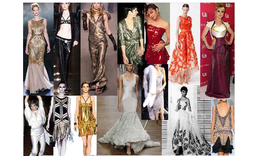 ВЕЧЕРНЯЯ ОДЕЖДА: Узкие формы с геометрическими краями. Гладкая ткань. Плотный металлик. Отделка бисером. Держащая форму, хорошо подогнанная, и красочная отделка. Асимметричные подолы. Игривые аксессуары. Облегающие платья с широкими плечами. Гладкие, очень открытые платья футляры. Платья с заниженной талией и акцентом на плечи. Платья в стиле Чикаго 30 -х годов. Брючный костюм с коротким пиджаком (короткий, вышитый бисером пиджак, широкие атласные «пижамные» брюки и т. д. ) Вечерние блузки, брюки, облегающие юбки и т. д. с блестящей отделкой.