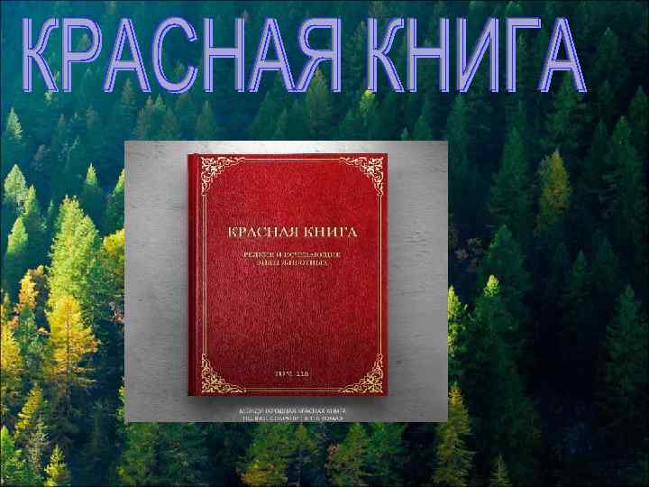 • • Кра сная кни га — аннотированный список редких и находящихся под угрозой исчезновения животных, растений и грибов. Красная книга является основным документом, в котором обобщены материалы о современном состоянии редких и находящихся под угрозой исчезновения видов растений и животных, на основании которых проводится разработка научных и практических мер, направленных на их охрану, воспроизводство и рациональное использование. В Красную книгу заносят виды растений и животных, которые постоянно или временно растут либо обитают в естественных условиях на определённой территории (преимущественно территории отдельно взятой страны), и находятся под угрозой исчезновения. Виды животных и растений, занесённые в Красную книгу подлежат особой охране на всей отдельной взятой территории, которую охватывает конкретное издание Красной книги. Красные книги бывают различного уровня — международные, национальные и региональные.