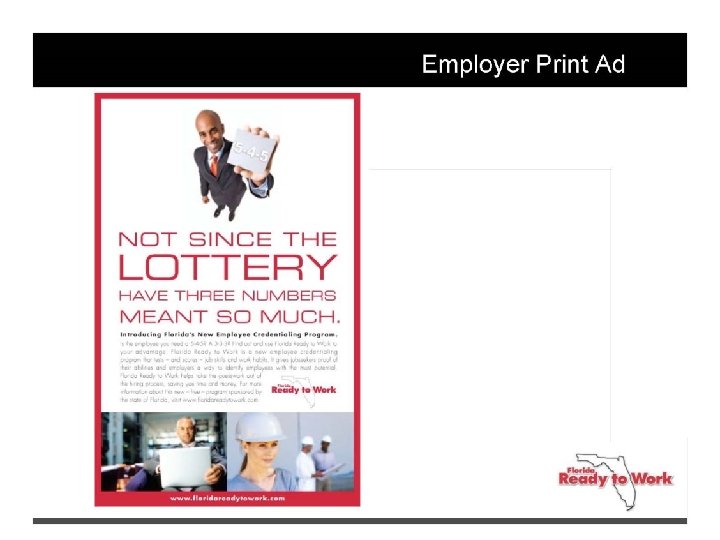 Employer Outreach Update § Launched employer-focused awareness campaign February 2008 § Secured support of statewide business organizations - Florida Chamber of Commerce - HR Florida (State affiliate for the Society of Human Resource Management) - Associated Industries of Florida § 125+ Employer Partners, list growing every day § Large and small, across industries, across the state § List posted www. floridareadytowork. comEmployer. Partners