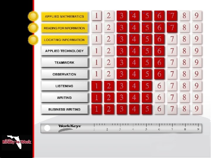 Florida Ready to Work § New employee credentialing program that builds, tests and scores job skills and work habits § Focus on core communication and problem-solving skills required by 85 percent of all jobs today - Applied Math – Workplace math ie: calculating percentage discounts and markups - Reading for Information – Using memos, letters, directions, signs, notices, bulletins, policies and regulations - Locating Information – Working with charts, graphs, tables, forms, flowcharts, diagrams, floor plans, maps and instrument gauges