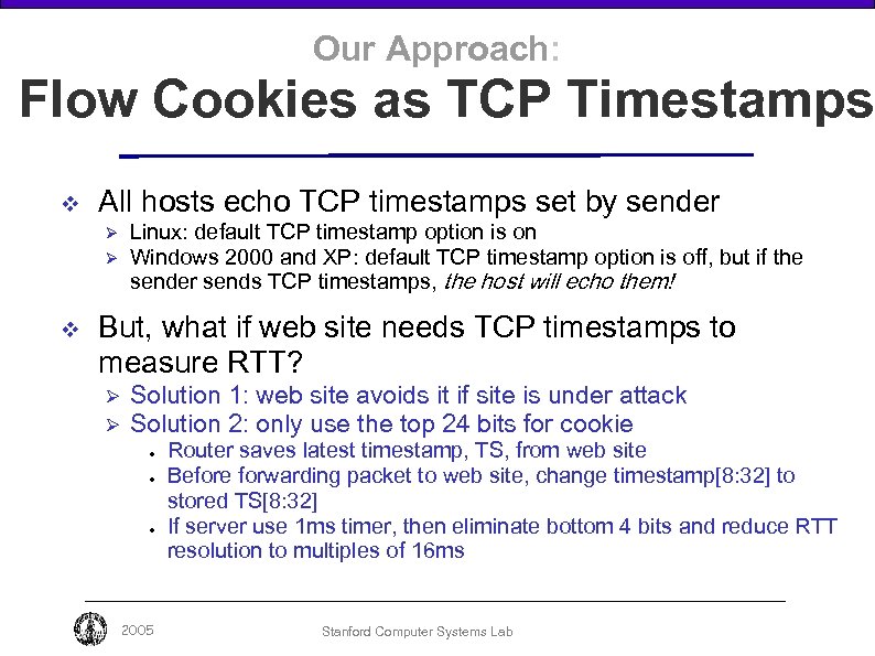 Our Approach: Flow Cookies as TCP Timestamps v All hosts echo TCP timestamps set by sender Ø Ø v Linux: default TCP timestamp option is on Windows 2000 and XP: default TCP timestamp option is off, but if the sender sends TCP timestamps, the host will echo them! But, what if web site needs TCP timestamps to measure RTT? Ø Ø Solution 1: web site avoids it if site is under attack Solution 2: only use the top 24 bits for cookie ● ● ● 2005 Router saves latest timestamp, TS, from web site Before forwarding packet to web site, change timestamp[8: 32] to stored TS[8: 32] If server use 1 ms timer, then eliminate bottom 4 bits and reduce RTT resolution to multiples of 16 ms Stanford Computer Systems Lab
