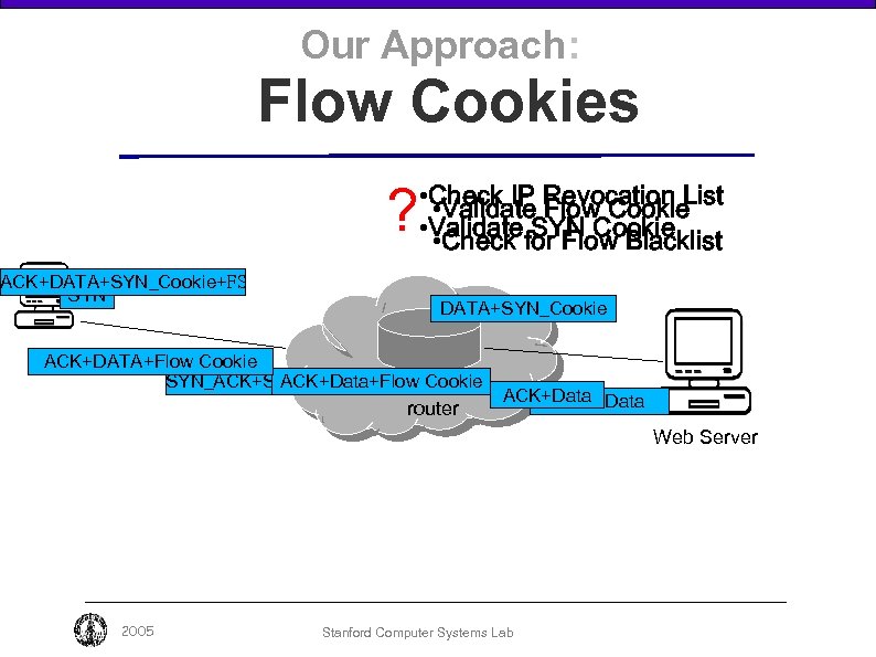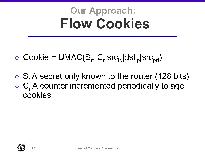Our Approach: Flow Cookies v v v Cookie = UMAC(Sr, Cr|srcip|dstip|srcprt) Sr A secret only known to the router (128 bits) Cr A counter incremented periodically to age cookies 2005 Stanford Computer Systems Lab