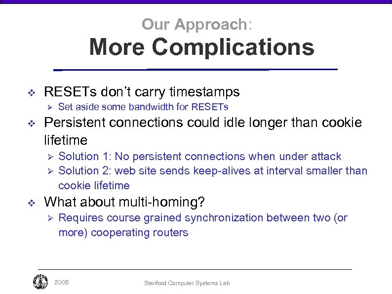 Our Approach: More Complications v RESETs don’t carry timestamps Ø v Persistent connections could idle longer than cookie lifetime Ø Ø v Set aside some bandwidth for RESETs Solution 1: No persistent connections when under attack Solution 2: web site sends keep-alives at interval smaller than cookie lifetime What about multi-homing? Ø Requires course grained synchronization between two (or more) cooperating routers 2005 Stanford Computer Systems Lab