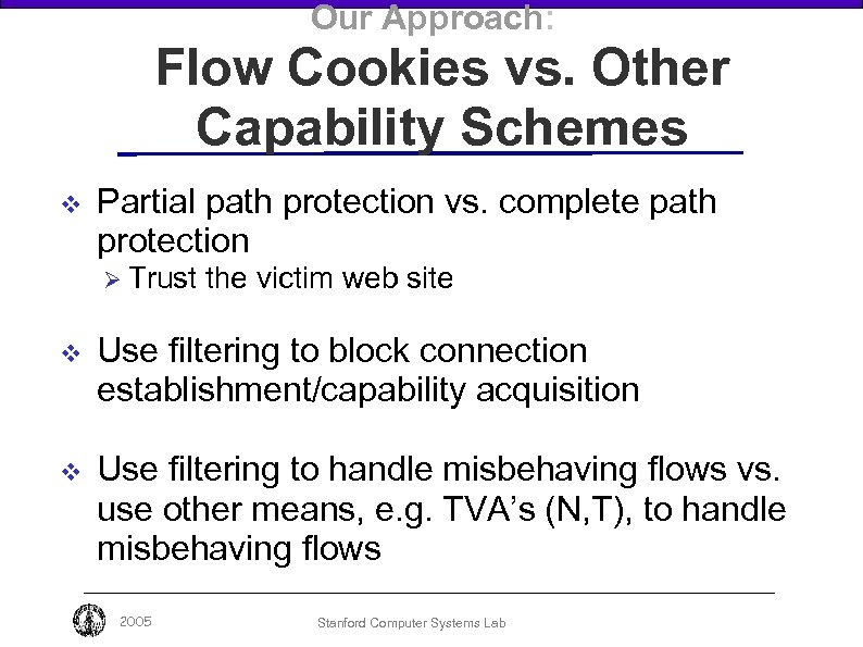 Our Approach: Flow Cookies vs. Other Capability Schemes v Partial path protection vs. complete path protection Ø Trust v v the victim web site Use filtering to block connection establishment/capability acquisition Use filtering to handle misbehaving flows vs. use other means, e. g. TVA’s (N, T), to handle misbehaving flows 2005 Stanford Computer Systems Lab