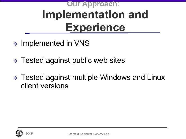 Our Approach: Implementation and Experience v Implemented in VNS v Tested against public web sites v Tested against multiple Windows and Linux client versions 2005 Stanford Computer Systems Lab