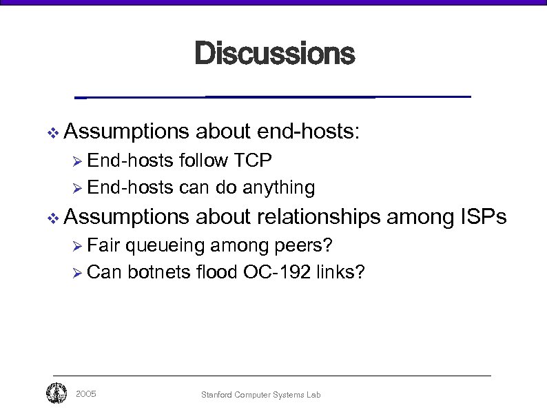 Discussions v Assumptions about end-hosts: Ø End-hosts follow TCP Ø End-hosts can do anything v Assumptions about relationships among ISPs Ø Fair queueing among peers? Ø Can botnets flood OC-192 links? 2005 Stanford Computer Systems Lab