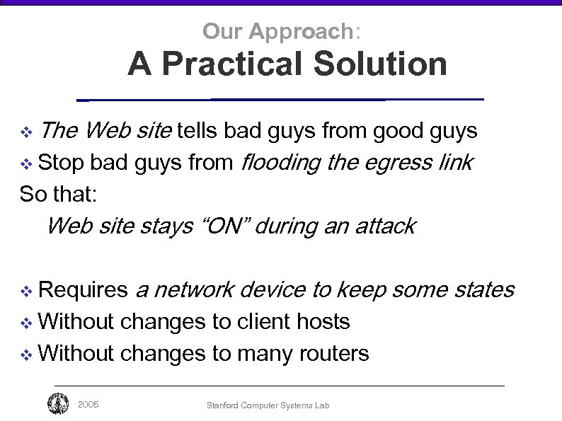 Our Approach: A Practical Solution v The Web site tells bad guys from good guys v Stop bad guys from flooding the egress link So that: Web site stays “ON” during an attack v Requires a network device to keep some states v Without changes to client hosts v Without changes to many routers 2005 Stanford Computer Systems Lab