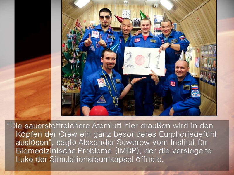 Wieder an die Erde gewöhnen Auf den ersten Blick waren die drei Russen, ein Franzose, ein Italiener und ein Chinese wohl auf, als sie in ihren blauen Raumfahrtanzügen aus der Forschungsröhre stiegen. Ein wenig blass um die Nasenspitzen sollen die Männer gewesen sein, die sich nur kurz dem anwesenden Publikum präsentierten. Die Ansteckungsgefahr durch Keime und Viren ist nun erhöht für die Marsonauten, die seit dem 03. Juni 2010 isoliert vom Rest der Welt lebten.