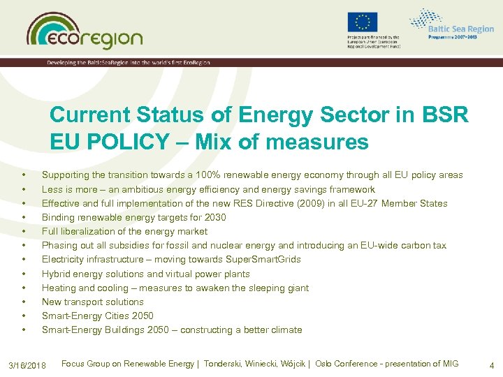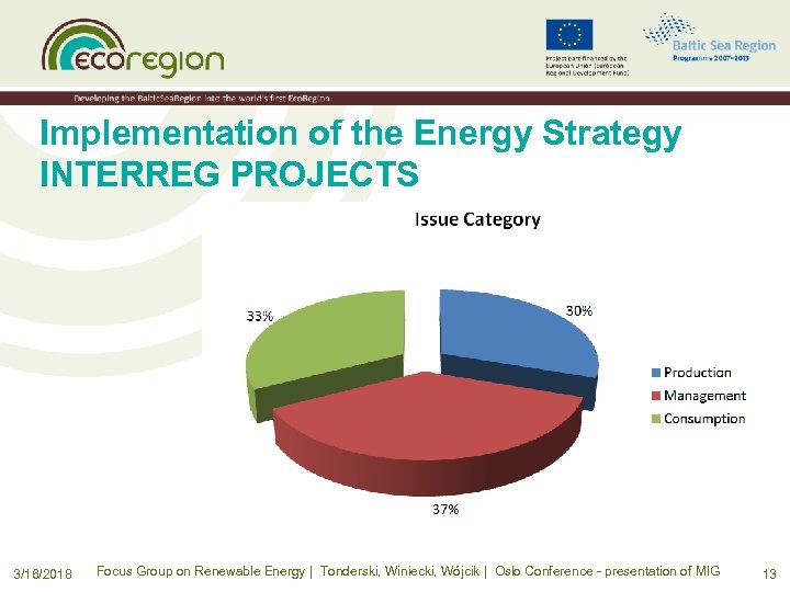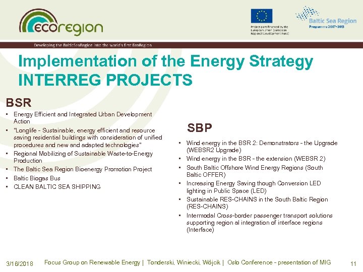Implementation of the Energy Strategy INTERREG PROJECTS 3/16/2018 Focus Group on Renewable Energy | Tonderski, Winiecki, Wójcik | Oslo Conference - presentation of MIG 13