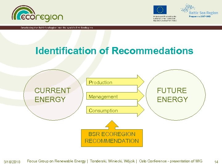 Identification of Recommedations Production CURRENT ENERGY Management FUTURE ENERGY Consumption BSR ECOREGION RECOMMENDATION 3/16/2018 Focus Group on Renewable Energy | Tonderski, Winiecki, Wójcik | Oslo Conference - presentation of MIG 14
