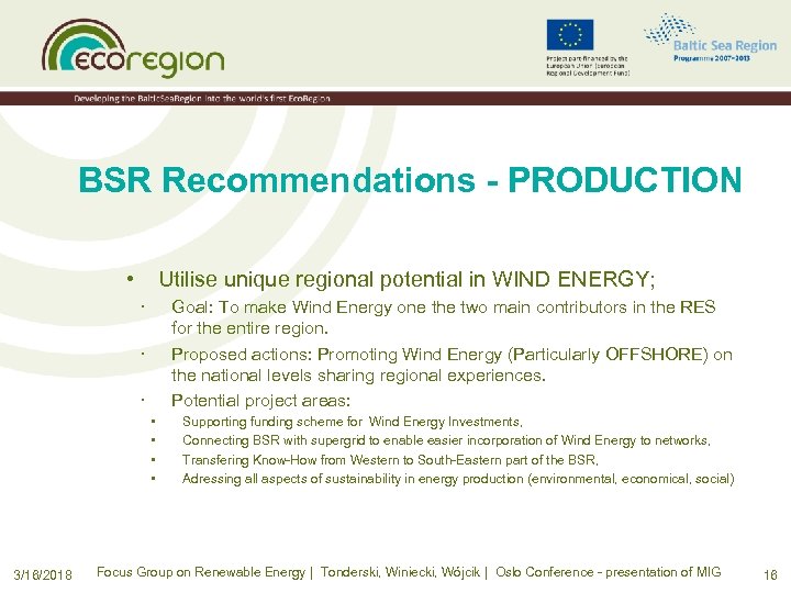 BSR Recommendations - PRODUCTION • Utilise unique regional potential in WIND ENERGY; · Goal: To make Wind Energy one the two main contributors in the RES for the entire region. Proposed actions: Promoting Wind Energy (Particularly OFFSHORE) on the national levels sharing regional experiences. Potential project areas: · · • • 3/16/2018 Supporting funding scheme for Wind Energy Investments, Connecting BSR with supergrid to enable easier incorporation of Wind Energy to networks, Transfering Know-How from Western to South-Eastern part of the BSR, Adressing all aspects of sustainability in energy production (environmental, economical, social) Focus Group on Renewable Energy | Tonderski, Winiecki, Wójcik | Oslo Conference - presentation of MIG 16