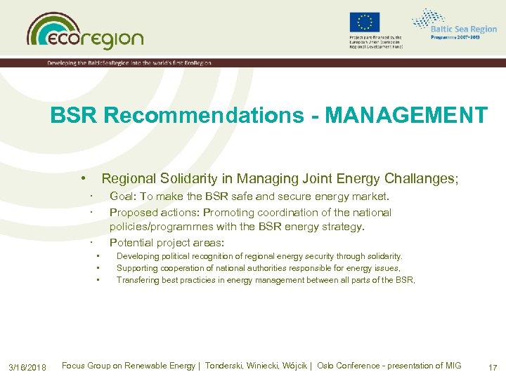 BSR Recommendations - MANAGEMENT • Regional Solidarity in Managing Joint Energy Challanges; · · Goal: To make the BSR safe and secure energy market. Proposed actions: Promoting coordination of the national policies/programmes with the BSR energy strategy. Potential project areas: · • • • 3/16/2018 Developing political recognition of regional energy security through solidarity. Supporting cooperation of national authorities responsible for energy issues, Transfering best practicies in energy management between all parts of the BSR, Focus Group on Renewable Energy | Tonderski, Winiecki, Wójcik | Oslo Conference - presentation of MIG 17