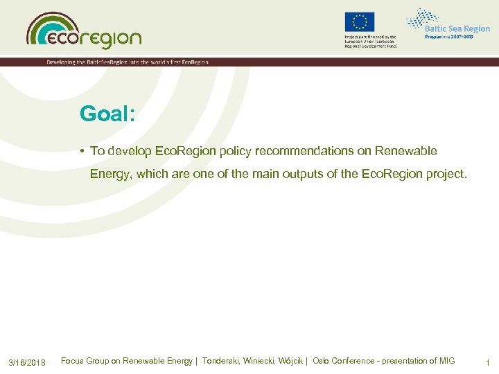 Goal: • To develop Eco. Region policy recommendations on Renewable Energy, which are one of the main outputs of the Eco. Region project. 3/16/2018 Focus Group on Renewable Energy | Tonderski, Winiecki, Wójcik | Oslo Conference - presentation of MIG 1