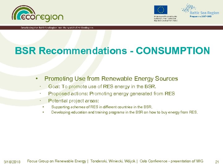 BSR Recommendations - CONSUMPTION • Promoting Use from Renewable Energy Sources · · · Goal: To promote use of RES energy in the BSR. Proposed actions: Promoting energy generated from RES Potential project areas: • • 3/16/2018 Supporting schemes of RES in different countries in the BSR, Developing education and training programs in the BSR on how to buy energy from RES, Focus Group on Renewable Energy | Tonderski, Winiecki, Wójcik | Oslo Conference - presentation of MIG 21