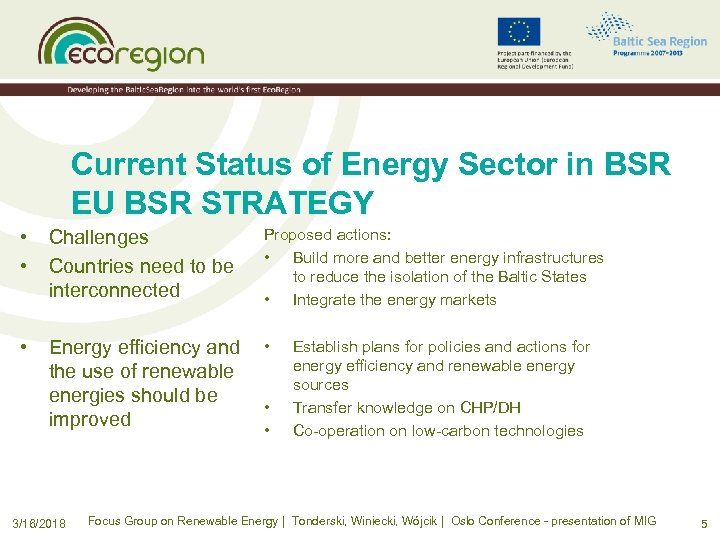 Current Status of Energy Sector in BSR EU POLICY – Mix of measures • • • Supporting the transition towards a 100% renewable energy economy through all EU policy areas Less is more – an ambitious energy efficiency and energy savings framework Effective and full implementation of the new RES Directive (2009) in all EU-27 Member States Binding renewable energy targets for 2030 Full liberalization of the energy market Phasing out all subsidies for fossil and nuclear energy and introducing an EU-wide carbon tax Electricity infrastructure – moving towards Super. Smart. Grids Hybrid energy solutions and virtual power plants Heating and cooling – measures to awaken the sleeping giant New transport solutions Smart-Energy Cities 2050 Smart-Energy Buildings 2050 – constructing a better climate 3/16/2018 Focus Group on Renewable Energy | Tonderski, Winiecki, Wójcik | Oslo Conference - presentation of MIG 4