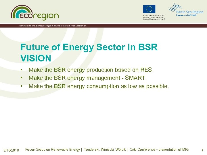 Future of Energy Sector in BSR VISION • • • 3/16/2018 Make the BSR energy production based on RES. Make the BSR energy management - SMART. Make the BSR energy consumption as low as possible. Focus Group on Renewable Energy | Tonderski, Winiecki, Wójcik | Oslo Conference - presentation of MIG 7