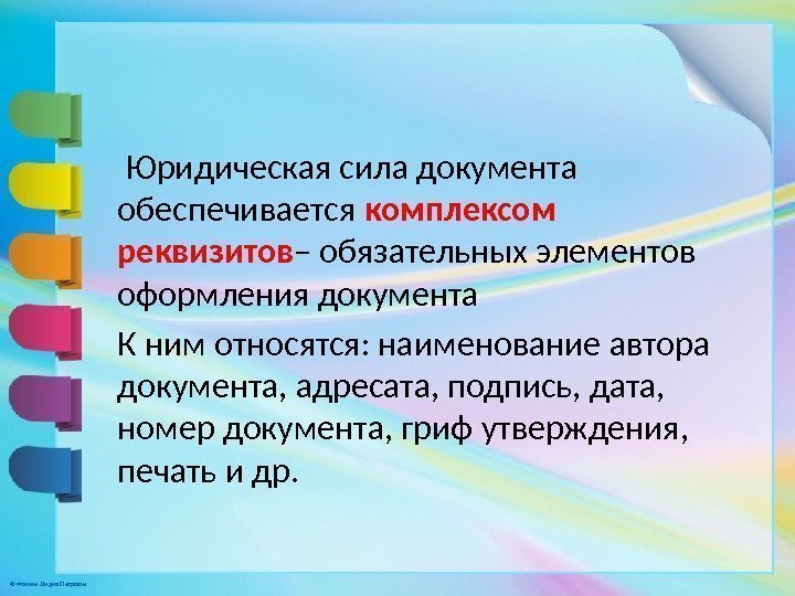© Фокина Лидия Петровна Юридическая сила документа обеспечивается комплексом реквизитов – обязательных элементов оформления документа К ним относятся: наименование автора документа, адресата, подпись, дата, номер документа, гриф утверждения, печать и др.