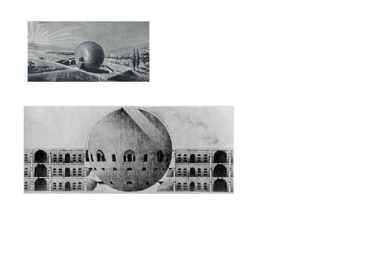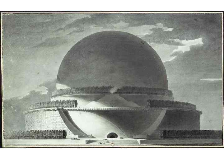 а также французских неоклассицистов, например Этьена-Луи Булле (тоже мало что построившего, но на бумаге создавшего более 100 проектов; один из самых известных — Кенотаф Ньютона, шар высотой в 150 метров, символизирующий то ли Вселенную, то ли Землю, то ли яблоко, благодаря которому был открыт закон всемирного тяготения).