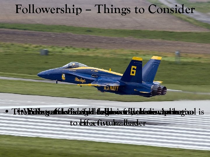 Followership – Things to Consider • The • Requires a highare also followerswhose goal is • Without dedicated degree ofis there can be no • Being effective follower is the not automatic most an Leaders follower self-discipline • effective followers, one to effective leaders be a future leader