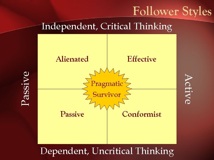 Follower Styles Independent, Critical Thinking Effective Pragmatic Survivor Passive Conformist Dependent, Uncritical Thinking Active Passive Alienated