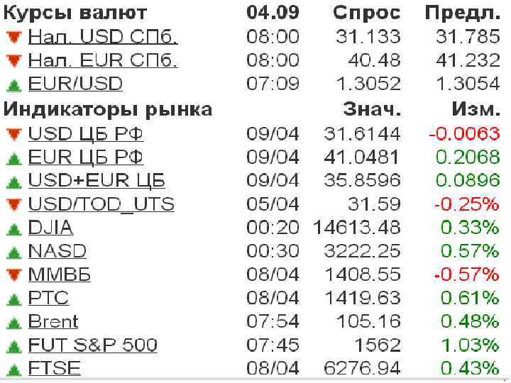 Российский рынок никак не вылезет из "медвежьей" ямы На российском рынке вскоре после положительного открытия активность покупателей пошла на убыль, а затем, даже несмотря на позитивную макростатистику из Европы, индекс ММВБ и вовсе скатился в "красную" зону и остановился на минимальной за последние три сессии отметке (1406, 86 пункта). По итогам торговой сессии 8 апреля индекс ММВБ снизился на 0, 57% до 1408, 55 пункта, индекс РТС прибавил 0, 61% и достиг отметки 1419, 63 пункта. Объем торгов на Московской Бирже по итогам дня составил 389, 26 млрд руб. На российском рынке вскоре после положительного открытия активность покупателей пошла на убыль, а затем, даже несмотря на позитивную макростатистику из Европы, индекс ММВБ и вовсе скатился в "красную" зону и остановился на минимальной за последние три сессии отметке (1406, 86 пункта). По итогам торговой сессии 8 апреля индекс ММВБ снизился на 0, 57% до 1408, 55 пункта, индекс РТС прибавил 0, 61% и достиг отметки 1419, 63 пункта. Объем торгов на Московской Бирже по итогам дня составил 389, 26 млрд руб.