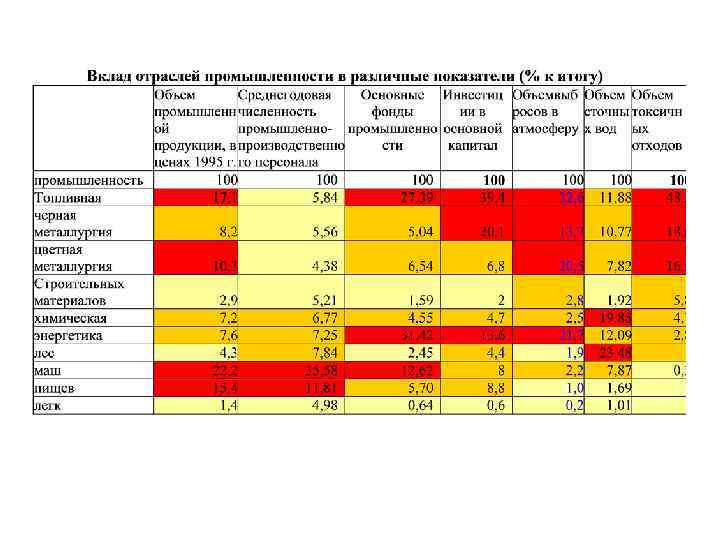 Пример расчета структуры промышленности Название отрасль Стоимость валовой продукции (тыс. руб. ) Стоимость ОПФ, тыс. руб Численность занятых, чел Нский маш. завод Маш 5000 2000 1000 З-д подщипников Маш 1000 2000 1000 Экскаваторный з-д Маш 10000 5000 3000 Радиозавод Маш 4000 1000 5000 20000 (28%) 10000 (3, 2%) 10000 (31%) Итого по машиностроению Металлургический к-т чермет 200000 10000 Трубный завод Чермет 30000 10000 50000 (69%) 300000 (96, 5%) 20000 (62%) Итого по черной металлургии Шоколадная фабрика пищ 1000 500 1000 Молочный завод пищ 500 300 500 Хлебкомбинат пищ 500 200 500 Итого по пищевой промышленности 2000 (3%) 1000 (0, 3%) 2000 (7%) Итого по промышленности 72000 (100%) 311000 (100%) 32000 (100%) Фондоемкость = стоимость фондов / стоимость продукции маш = 10000 руб/20000 руб=0, 5 чер. мет. =300000/50000=6 пищ= 1000/2000 = 0, 5 Фондовооруженность = стоимость фондов/численность занятых маш = 10000 руб/10000 руб=1 чер. мет. =300000/20000=15 пищ= 1000/2000 = 0, 5 Фондоотдача = объем продукции / стоимость фондов маш = 20000 руб/10000 руб=2 чер. мет. =50000/300000=0, 167 пищ= 2000/1000 = 1