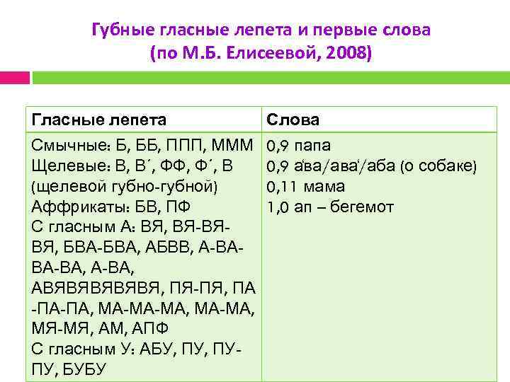 Губные гласные лепета и первые слова (по М. Б. Елисеевой, 2008) Гласные лепета Смычные: Б, ББ, ППП, МММ Щелевые: В, Вˊ, ФФ, Фˊ, В (щелевой губно-губной) Аффрикаты: БВ, ПФ С гласным А: ВЯ, ВЯ-ВЯВЯ, БВА-БВА, АБВВ, А-ВАВА-ВА, АВЯВЯВЯ, ПЯ-ПЯ, ПА -ПА-ПА, МА-МА-МА, МЯ-МЯ, АМ, АПФ С гласным У: АБУ, ПУПУ, БУБУ Слова 0, 9 папа 0, 9 а ва/ава /аба (о собаке) 0, 11 мама 1, 0 ап – бегемот