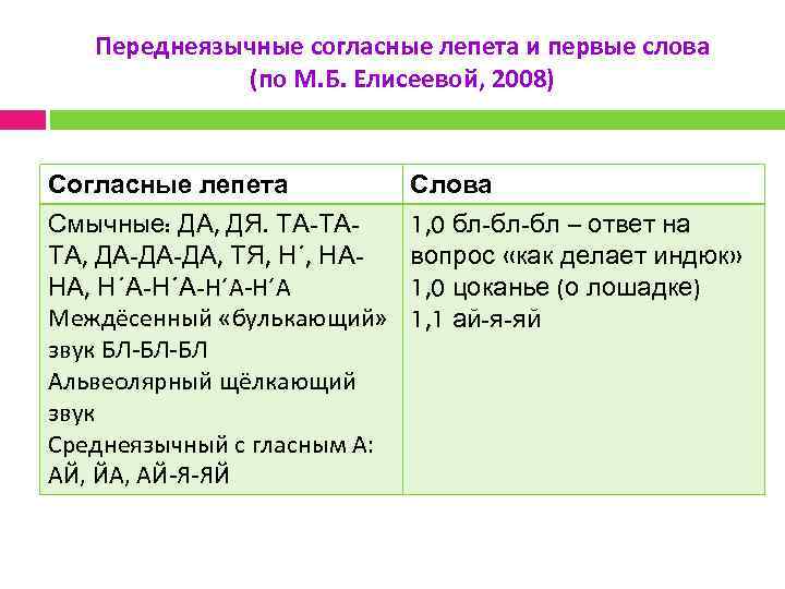 Переднеязычные согласные лепета и первые слова (по М. Б. Елисеевой, 2008) Согласные лепета Смычные: ДА, ДЯ. ТА-ТАТА, ДА-ДА-ДА, ТЯ, Нˊ, НАНА, НˊА-НˊА-НˊА Междёсенный «булькающий» звук БЛ-БЛ-БЛ Альвеолярный щёлкающий звук Среднеязычный с гласным А: АЙ, ЙА, АЙ-Я-ЯЙ Слова 1, 0 бл-бл-бл – ответ на вопрос «как делает индюк» 1, 0 цоканье (о лошадке) 1, 1 ай-я-яй