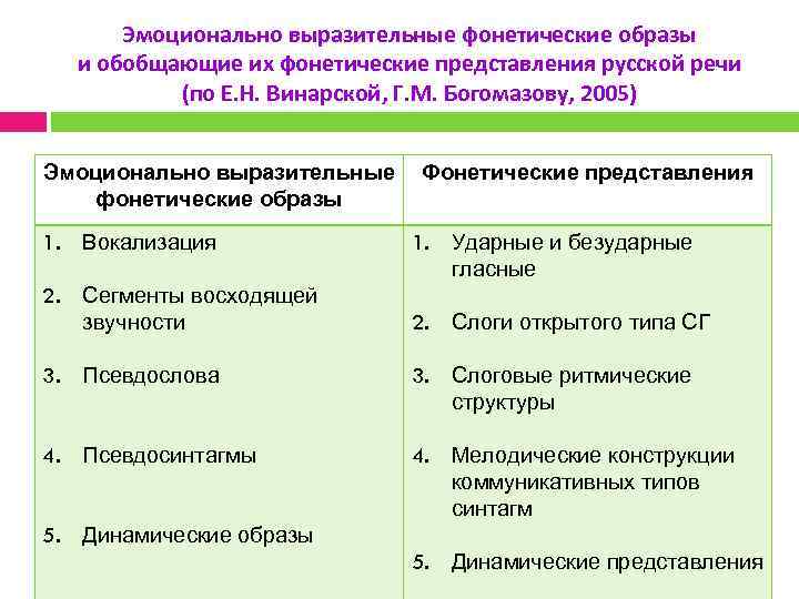 Эмоционально выразительные фонетические образы и обобщающие их фонетические представления русской речи (по Е. Н. Винарской, Г. М. Богомазову, 2005) Эмоционально выразительные фонетические образы 1. Вокализация 2. Сегменты восходящей звучности Фонетические представления 1. Ударные и безударные гласные 2. Слоги открытого типа СГ 3. Псевдослова 3. Слоговые ритмические структуры 4. Псевдосинтагмы 4. Мелодические конструкции коммуникативных типов синтагм 5. Динамические образы 5. Динамические представления