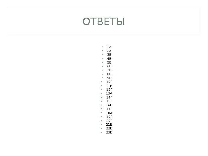 ОТВЕТЫ • 1 А • 2 А • 3 В • 4 В • 5 Б • 6 Б • 7 В • 8 Б • 9 Б • 10 Г • 11 Б • 12 Г • 13 А • 14 Г • 15 Г • 16 Б • 17 Г • 18 А • 19 Г • 20 Г • 21 В • 22 Б • 23 Б