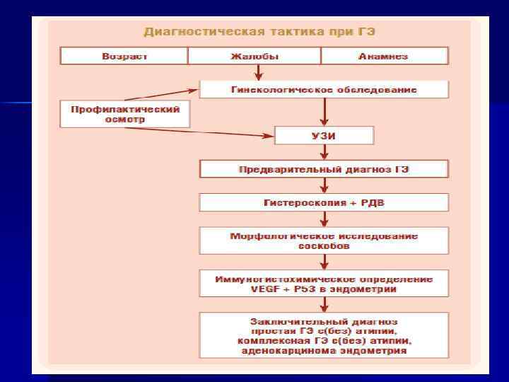 Диагностический алгоритм ПАТОЛОГИИ ЭНДОМЕТРИЯ И РТМ 1) Состояние менструальной функции 2) Выявление факторов риска 3) УЗИ ОМТ Эхоскопические признаки ГЭ: - неоднородность структуры эндометрия - толщина эндометрия > 15± 0, 4 мм - толщина эндометрия > 5 -7 мм в постменопаузе 4) допплерография – усиление кровотока и индекса резистентности (в нормальном эндометрии кровоток медленный и не регистрируется при ЦДК)